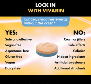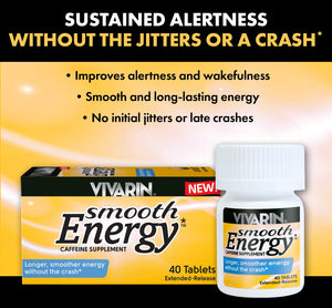 Vivarin Smooth Energy® helps you power through your day with steady focus and confidence. Whether you’re working, studying, driving, or just need an energy lift, its dual-release design gives you the boost you want—without the jitters you don’t. Enjoy smooth, balanced energy that keeps up with your busy life.*